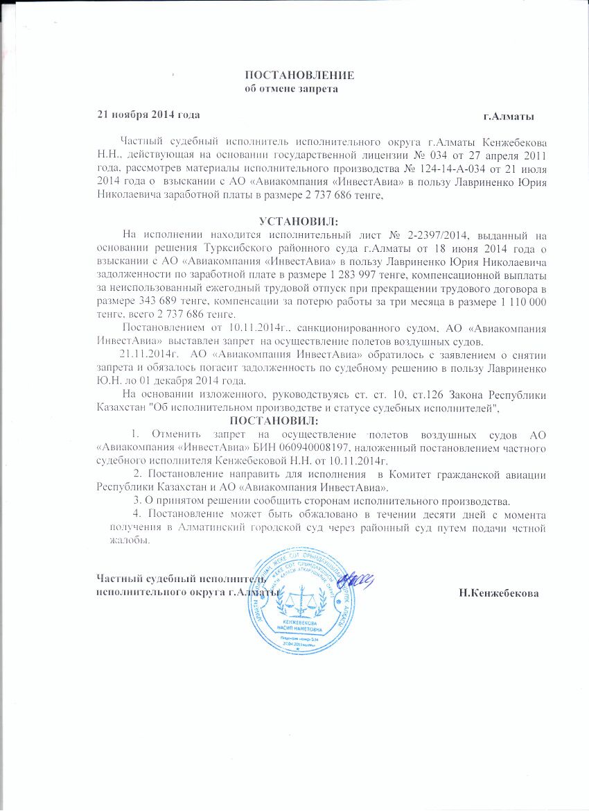 Компания "Инвест Авиа" предоставила еще одно постановление этого же судебного исполнителя, датированное 21 ноября. В нем указано, что перевозчик подал заявление о обязался погасить задолженность перед работником до 1 декабря 2014 года. На основании этого документа судебный исполнитель постановил отменить запрет на осуществление полетов. Однако это постановление судом еще не санкционировано.