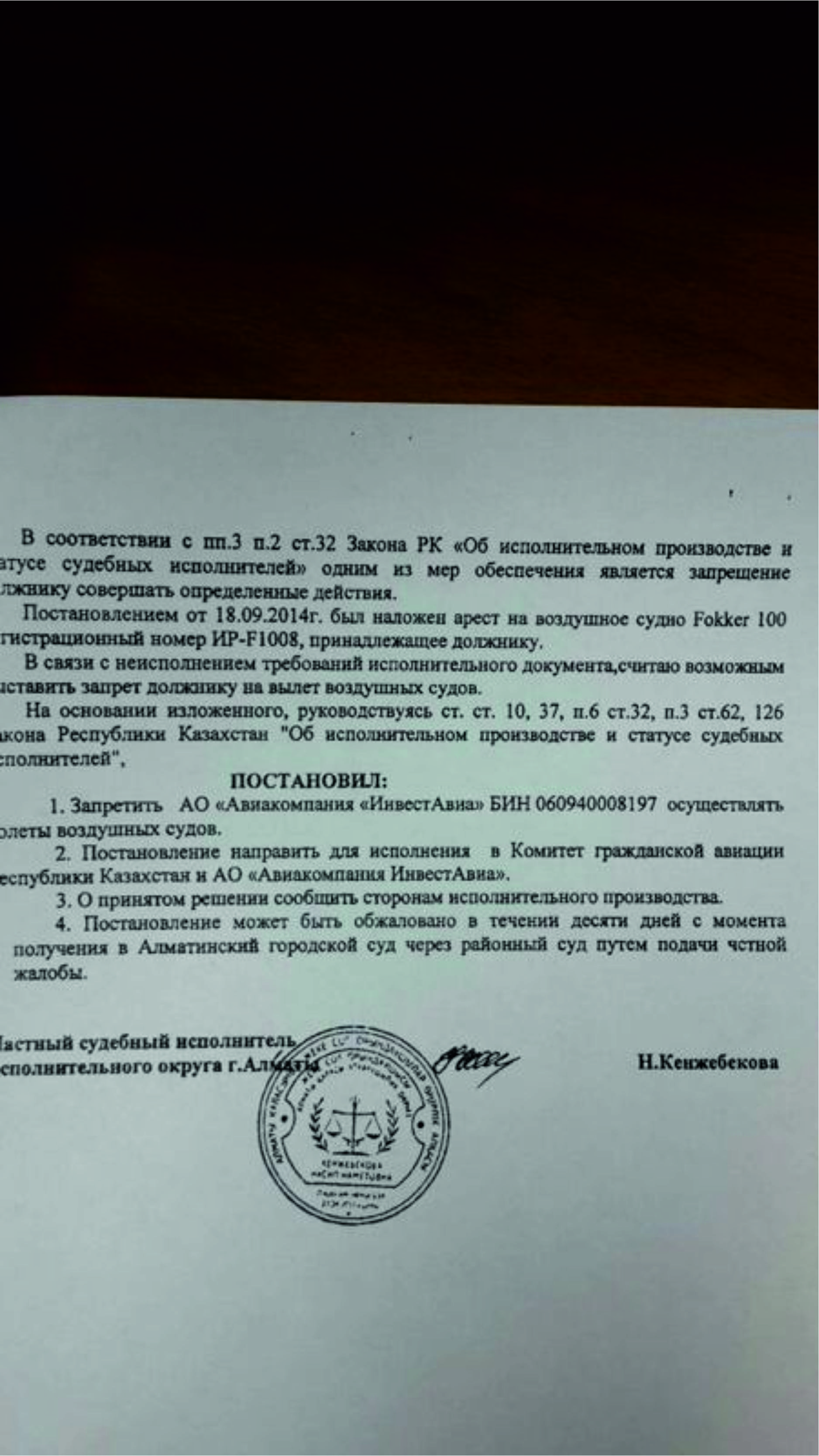 Как отмечается в постановлении, по закону "Об исполнительном производстве и статусе судебных исполнителей", одним из мер обеспечения выполнения обязательств является запрет на совершение должником определенных действий. В сентябре был наложен арест на самолет Fokker 100, принадлежащий "Инвест Авиа". Добавим, что постановление судебного исполнителя о запрете "Инвест Авиа" осуществлять перелеты было санкционировано Турксибским районным судом.