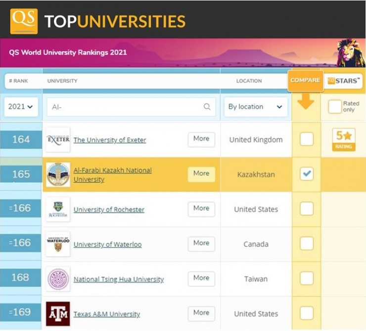 Казахский национальный университет имени аль-Фараби, находящийся в Алматы, поднялся в глобальном рейтинге QS World University Rankings 2021 на 165-ю позицию, передает Tengrinews.kz со ссылкой на пресс-службу вуза.