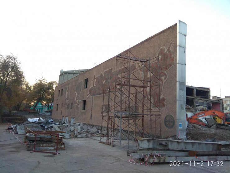 В "Целинном также сообщили, что выполняется демонтаж стены с репликой сграффито Евгения Сидоркина. Основную стену со сграффито, которая подлежит усилению, демонтировали успешно, крупными блоками для последующей реставрации после установки на прежнюю ось.