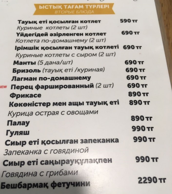 Как объяснили сотрудники столовой, заказать можно только второе блюдо. Гарнир, салаты и первые блюда в стоимость не входят. Из горячего вы сможете выбрать все, кроме бешбармака фетучини. Таким образом, за 500 тенге можно отобедать куриными котлетами (две штуки), котлетами по-домашнему (две штуки), куриными котлетами с сыром (две штуки), мантами, бризолью, пловом, лагманом по-домашнему, перцем фаршированным, курицей с овощами, гуляшем, запеканкой с говядиной и говядиной с грибами на выбор. В обычные дни стоимость этих блюд варьируется от 590 до 990 тенге. Бешбармак фетучини стоит 2 290 тенге.