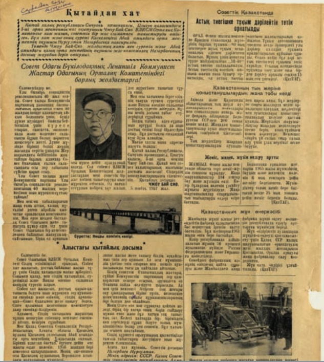 "В годы политического сближения СССР и КНР и укрепления советско-китайской дружбы Назарбаев переписывался с молодым учителем из Китая Чжоу Бай Сяо. Вначале письмо от гражданина КНР поступило в ЦК ВЛКСМ, после чего оно было перенаправлено секретарю Каскеленского райкома. Но к нему оно попало намного позже. Тогда был найден товарищ китайского учителя по переписке - десятиклассник Нурсултан Назарбаев. Оба письма были опубликованы на страницах газеты", - рассказала экскурсовод.