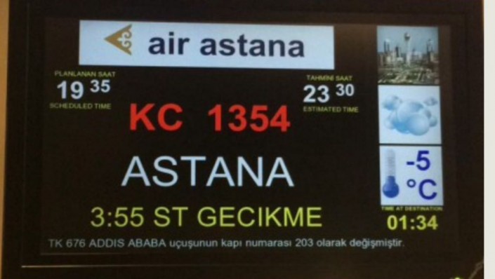 Между тем в аэропорту Астаны информацией об отмене рейсов не владеют. В справочной отмечают, что рейс из Стамбула в Астану задерживается только на несколько часов и прилет ожидается в 06.00 по времени Астаны.