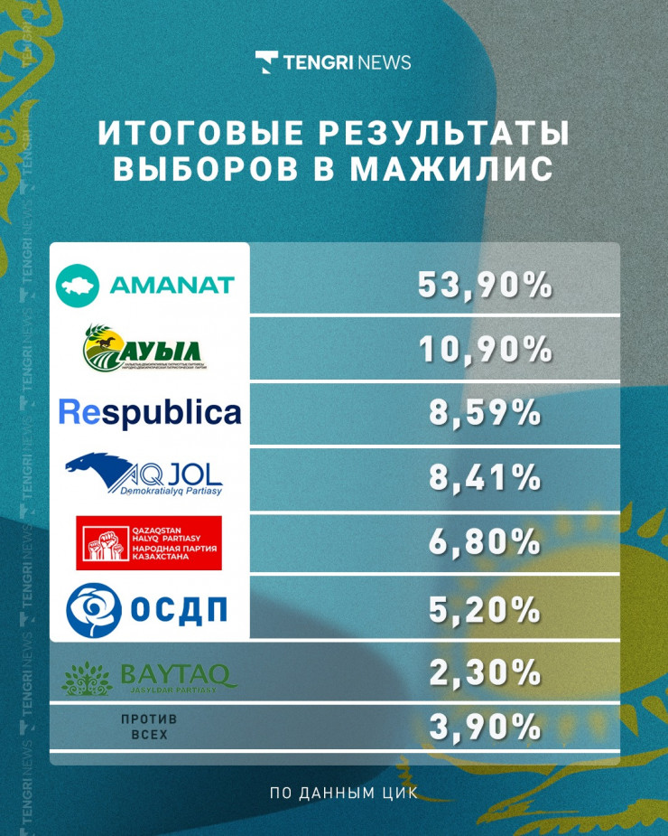 Напомним, выборы депутатов Мажилиса и маслихатов прошли 19 марта в Казахстане. В Центральной избирательной комиссии подвели итоги внеочередных выборов депутатов Мажилиса Парламента.