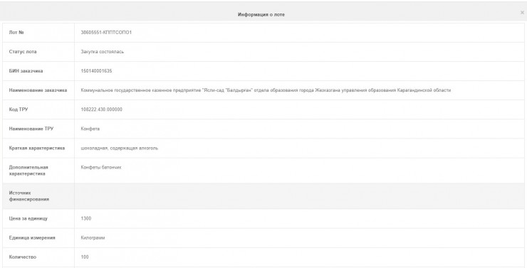 Лот о покупке 100 килограммов шоколадных конфет, содержащих алкоголь, объявлен на сайте goszakup.kz. По данным сайта, закуп уже состоялся. В техспецификациях лота указано, что конфеты должны быть шоколадные, в виде батончика, и содержать алкоголь.
