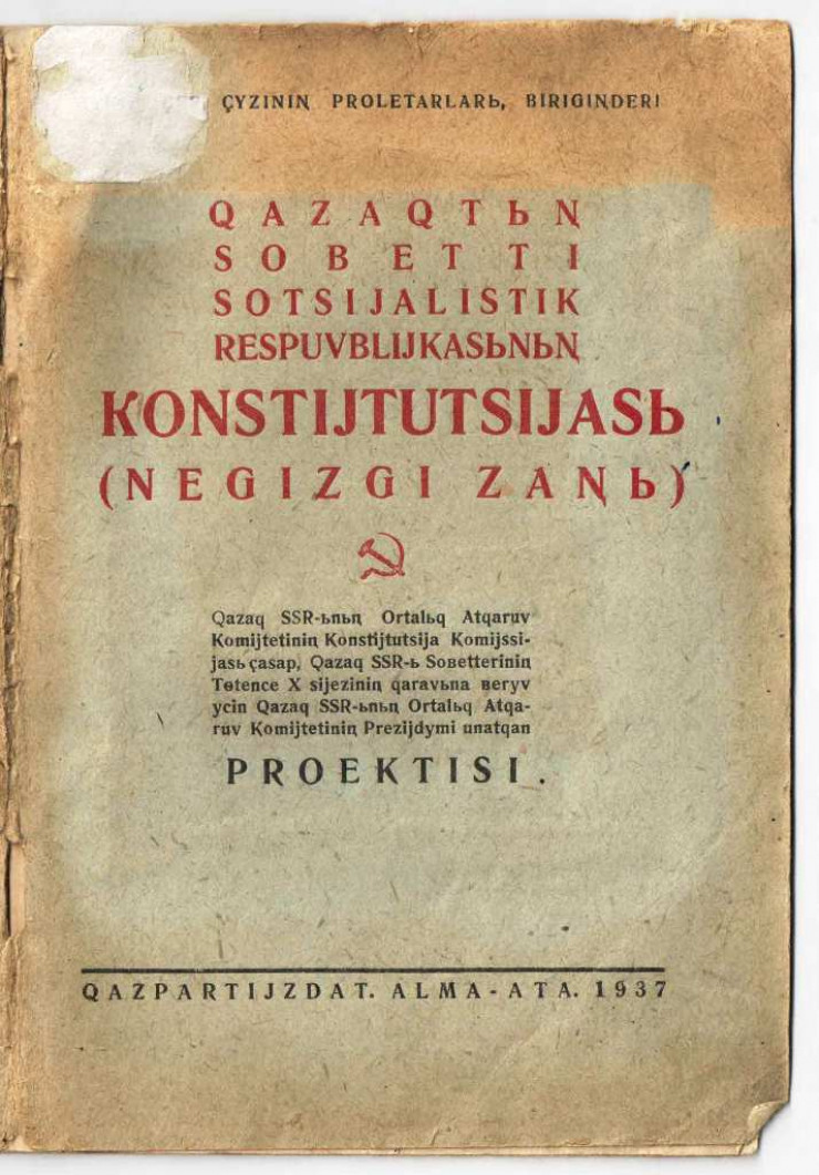 1937 жылдың 26 наурызында Х бүкіл қазақтар құрылтай кеңесінде қабылданған Қазақ ССР Конституциясы 11 бөлім және 124 баптан құрылды. Онда: "СССР Конституциясының 14-бабынан тыс Қазақ ССР-і өзінің тәуелсіз құқықтарын толық сақтай отырып, мемлекеттік билікті өз бетімен жүзеге асырады" деп жазылған.