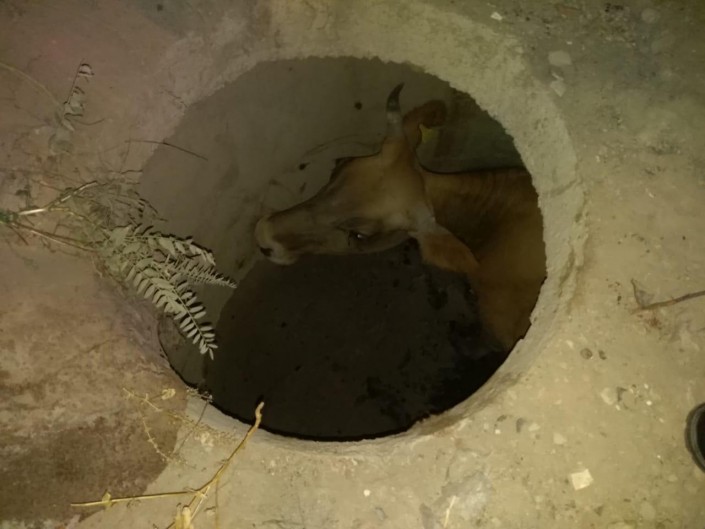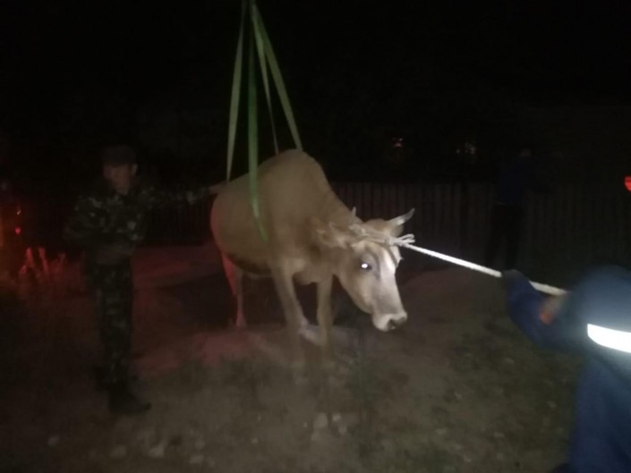 В спасательной операции были задействованы семь человек и две единицы техники. Они извлекли корову с помощью подъемного механизма.