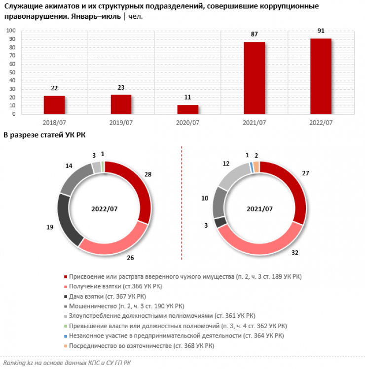 За первое полугодие такие правонарушения совершил 91 служащий акиматов и их структурных подразделений. Это рекордное значение за последние годы. К примеру, в аналогичном периоде 2021 года "за руку" поймали 87 коррупционеров.