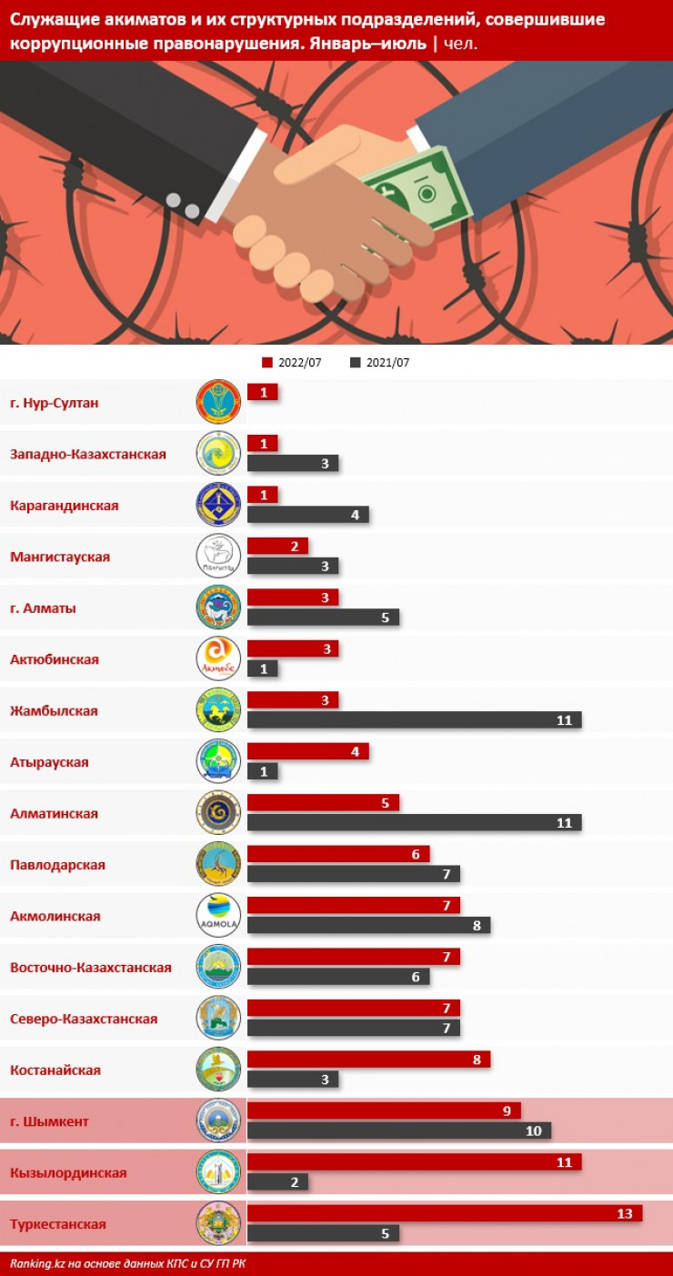 Аналитики Ranking.kz подсчитали коррупционные правонарушения, совершенные служащими акиматов и их структурных подразделений с января по июль 2022 года, и выяснили, в каких регионах на коррупции попадаются чаще всего, передает корреспондент Tengrinews.kz.