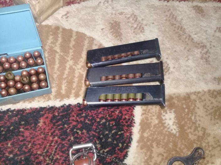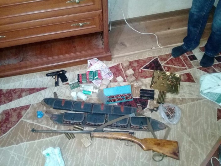 Отмечается, что при обыске по месту проживания задержанного, его гаража и цеха обнаружен и изъят арсенал оружия и боеприпасов: два пистолета, три гладкоствольных и мелкокалиберных ружья, три глушителя от пистолета ПМ, более 2 000 патронов разного калибра, запасные детали к огнестрельному оружию, инструменты для работы с оружием, средства для изготовления боевых патронов, более 500 грамм пороха, восемь охотничьих ножей.