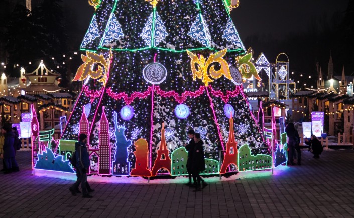 Она оформлена праздничной иллюминацией, новогодними украшениями в национальном стиле и декоративным световым ограждением в виде достопримечательностей мира. Выполнена из металлокаркаса, обшита искусственной хвоей, украшена гирляндами разных видов, новогодними украшениями, объемными орнаментами и звездой на макушке. Также во всех районах города установлено 45 елок.