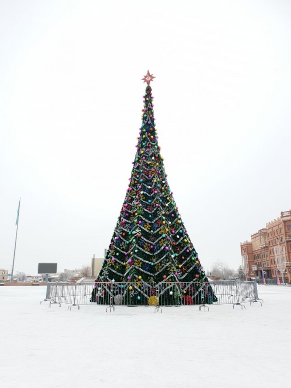Главная елка города, установленная на Центральной площади, была приобретена в 2013 году. Ее высота - более 15 метров. В этом году на ее установку и послепраздничный демонтаж из бюджета выделены 2 миллиона 132 тысячи тенге. Елка украшена 520 метрами гирлянд и светодиодных лент, на ней более 300 елочных игрушек.