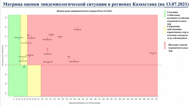 В "красной" зоне: города Нур-Султан, Алматы, Шымкент, Акмолинская, Актюбинская, Атырауская, Западно-Казахстанская, Карагандинская, Костанайская, Мангистауская, Павлодарская и Северо-Казахстанская области.