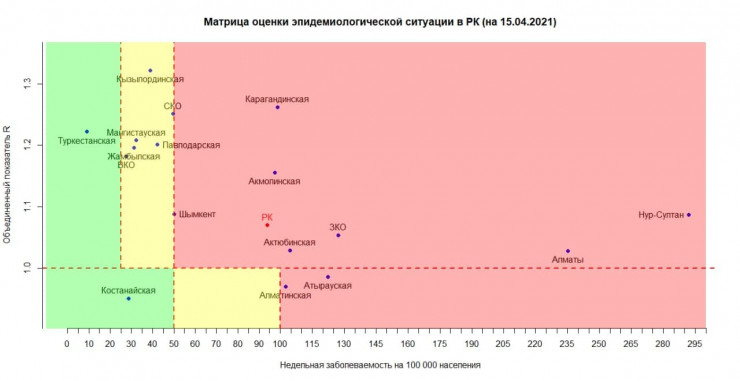 Сообщается, что в "красной" зоне находятся Нур-Султан, Алматы, Шымкент, Атырауская, Актюбинская, Акмолинская, Алматинская, Западно-Казахстанская, Карагандинская области.