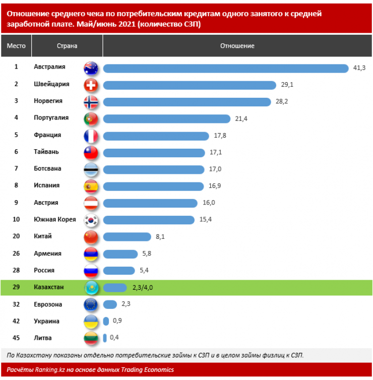 По этому показателю Казахстан также уступает многим рассмотренным экономикам мира. Казахстан находится на 29-м месте, если учитывать абсолютно все виды кредитов физлиц. При таком раскладе средний объем розничных займов на занятого гражданина перекрывается четырьмя средними заработными платами. Если же брать исключительно потребительские займы, то средний чек на занятого составляет всего 2,3 СЗП.