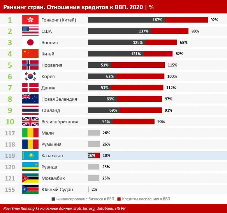 Аналитики также отмечают, что в сравнении с развитыми странами уровень проникновения кредитов в Казахстане остается не таким высоким. В странах с высоким уровнем промышленного производства совокупный уровень кредитов существенно превышал ВВП страны. Портфели кредитов населению и бизнесу в десятке сильных экономик мира варьировались от 112 и 51 процента к ВВП. В Казахстане это соотношение составляло лишь 10 и 16 процентов соответственно, что говорит о возможном недофинансировании экономики заемными средствами. Казахстан занимал лишь 119-е место среди 155 стран с доступной статистикой.