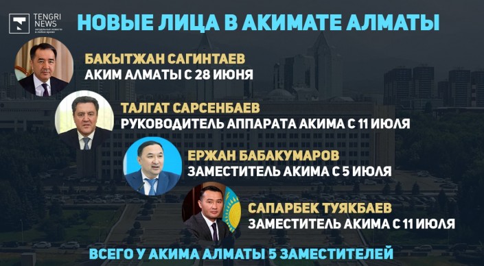 28 июня на пост акима Алматы был назначен Бакытжан Сагинтаев. Его предшественник Бауыржан Байбек после четырех лет на посту градоначальника стал первым заместителем председателя партии "Нур Отан".