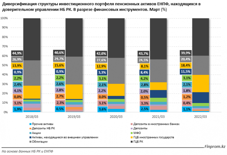 Растет доля активов во внешнем управлении - до 11,5 процента, по сравнению с 8,4 процента в прошлом году. Что касается остальных финансовых инструментов, то тут мы наблюдаем уменьшение доли в годовом выражении. Речь о ценных бумагах международных финансовых организаций, акциях, депозитах в банках Казахстана и в иностранных банках.