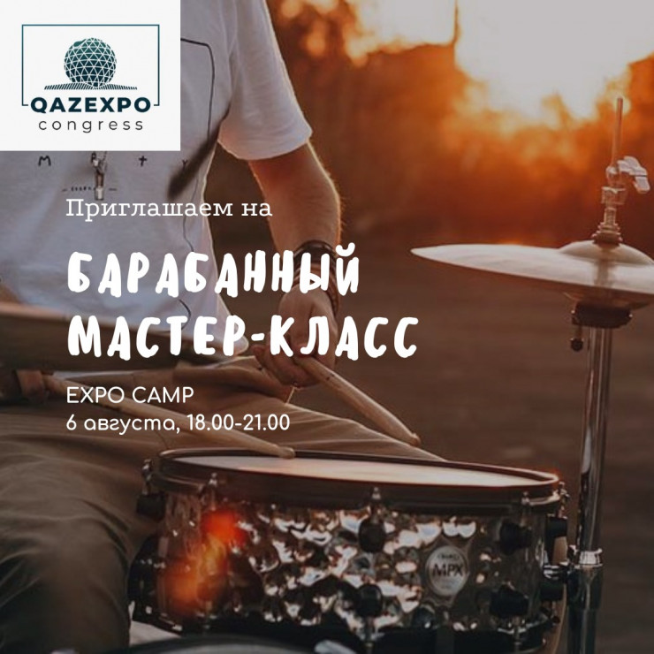 На открытой площадке EXPO Camp у подножия сферы "Нур-Алем" со стороны Mega Silk Way в эти выходные для всех желающих пройдут мастер-классы. В субботу на площадке оборудуют сцену с барабанной установкой. Любой желающий сможет получить инструкции от учителя и сыграть несложный ритм или любимую песню.