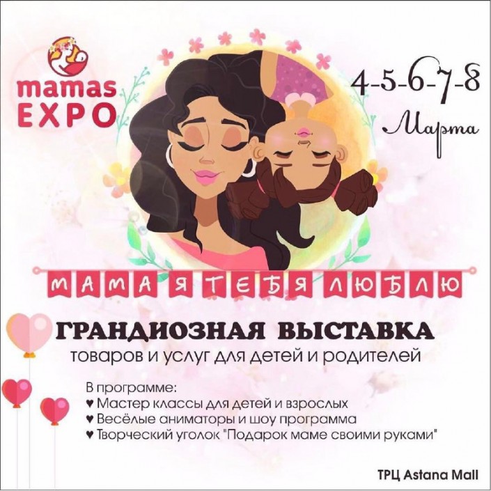 Праздничная выставка в ТРЦ Astana MALL "Мама, я тебя люблю!" организует мастер-классы, где дети смогут сделать подарки мамам и бабушкам своими руками. А женщин ждут интересные семинары по нумерологии, визажу, правильному питанию, стилю и йоге. Лейтмотив выставки - семья, поэтому организаторы Mamas Expo презентуют посетителям магазины игрушек, детской и взрослой одежды, детские сады и развивающие центры, хэндмейд-мастеров, товары для беременных, салоны красоты, а также медицинские и спортивные центры.