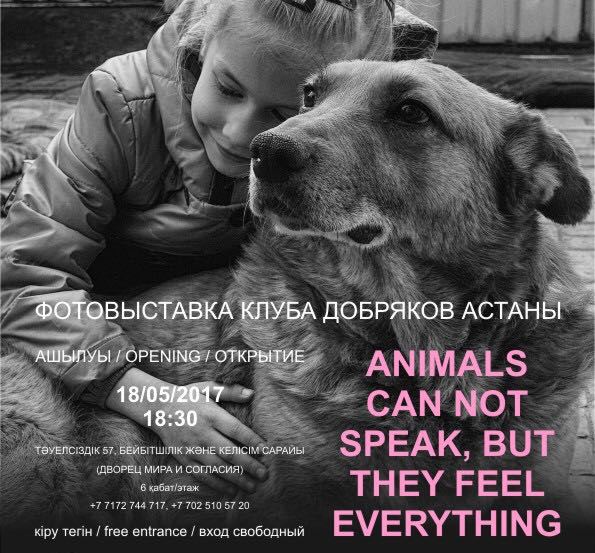 Клуб добряков Астаны при поддержке Центра современного искусства "Куланши" приглашает на открытие фотовыставки "Они чувствуют" во Дворце Мира и Согласия. В экспозиции будут представлены фотографии неравнодушных людей, подаривших свою любовь и тепло бездомным животным.