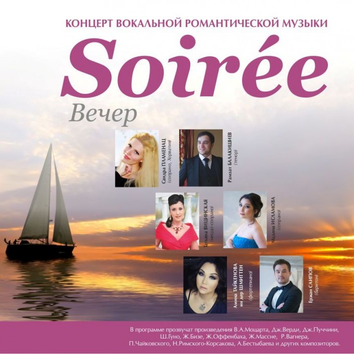 Концерт вокальной романтической музыки "Soirée" ("Вечер") с участием солистов театра "Астана Опера" и гостьи из Хорватии Сандры Пламенац (сопрано) пройдет в Камерном зале. В программе прозвучат произведения Оффенбаха, Моцарта, Верди, Пуччини, Вагнера, Чайковского, Римского-Корсакова, Бестыбаева и других композиторов.
