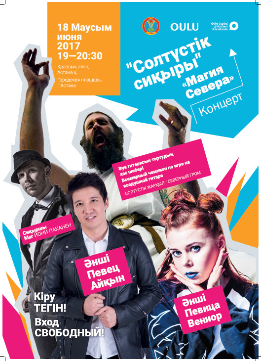 На городской площади перед столичным акиматом пройдет концерт финской музыки "Магия севера". Концерт станет подарком Астане от финского города-побратима Оулу. На концерте выступят ряд известных артистов и исполнителей из Финляндии и Казахстана, такие как знаменитая на международной арене финская певица Вениор (Venior), являющаяся автором песен, с очень красивым голосом.