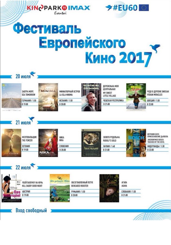 С 20 по 22 июля в г. Алматы в кинотеатре "Kinopark 11 IMAX Esentai"  проходит Фестиваль европейского кино в рамках празднования 60-летия подписания Римского договора. В этом году широкой публике будут представлены лучшие кинофильмы государств-членов Европейского Союза. В программу фестиваля вошли 11 фильмов из Чехии, Австрии, Швеции, Эстонии, Испании, Словении, Германии, Франции, Румынии, Словакии и Латвии. Организатором фестиваля выступает Представительство Европейского Союза в Казахстане.