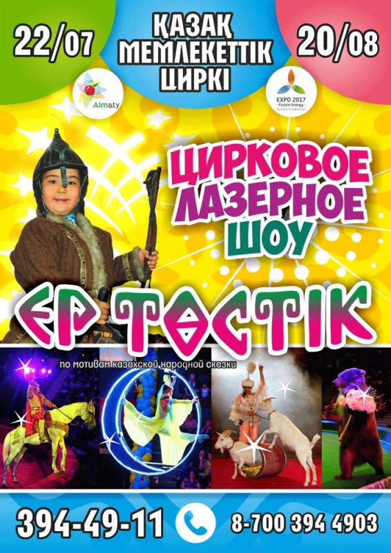 Специально к EXPO-2017 Казгосцирк готовит новую, эксклюзивную, волшебную программу по мотивам казахской народной сказки "Ер Төстік". Оригинальный сценарий, яркий и наполненный необычными поворотами сюжет, уникальные цирковые номера, головокружительные трюки, около двухсот дизайнерских костюмов, необычный реквизит и новейшие сценические технологии смогут удивить и детей и взрослых.