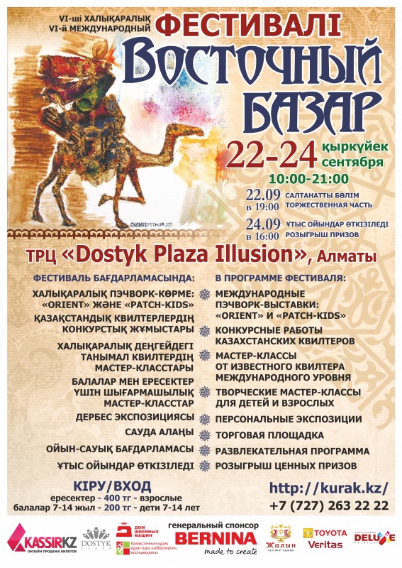 В Dostyk Plaza Illusion состоится фестиваль "Восточный базар". Гостей ждет много интересного и познавательного: международная путешествующая выставка Orient, детская международная выставка Patch-Kids, ярмарка hand-maderoff, торговая площадка. На фестивале будут представлены работы иностранных и казахстанских мастеров в технике квилтинг и пэчворк. Также будет продемонстрирован швейный перфоманс "От иголки до суперкомпьютера". Главная цель фестиваля - познакомить широкую публику с международными работами и вдохновить казахстанских мастеров на создание новых шедевров.