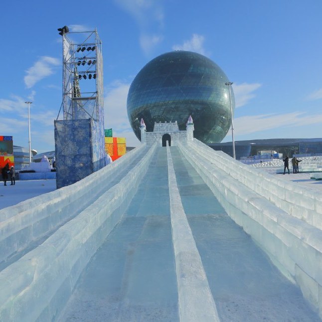 Самая большая снежная горка расположена на площади у монумента "Қазақ Елі". Длина ската составляет более 160 метров.
