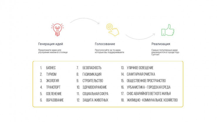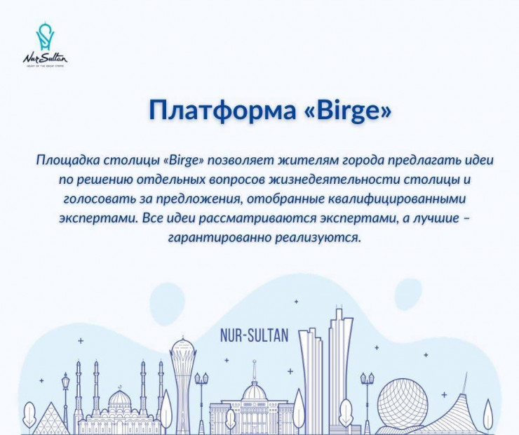 "Процесс функционирования платформы прост: первое - предложение идеи, второе - отбор, третье - реализация проекта. Самые лучшие предложения жителей реализуем в городе! Столицу развиваем в рамках мастер-плана "Нур-Султан - комфортный город", сделать город по-настоящему комфортным сможем сообща!" - добавил Кульгинов.