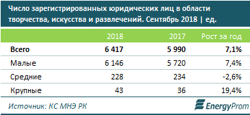 К октябрю число зарегистрированных компаний, работающих в сфере креатива и развлечения казахстанцев, достигло уже 6,4 тысячи - на 7,1 процента больше, чем годом ранее.