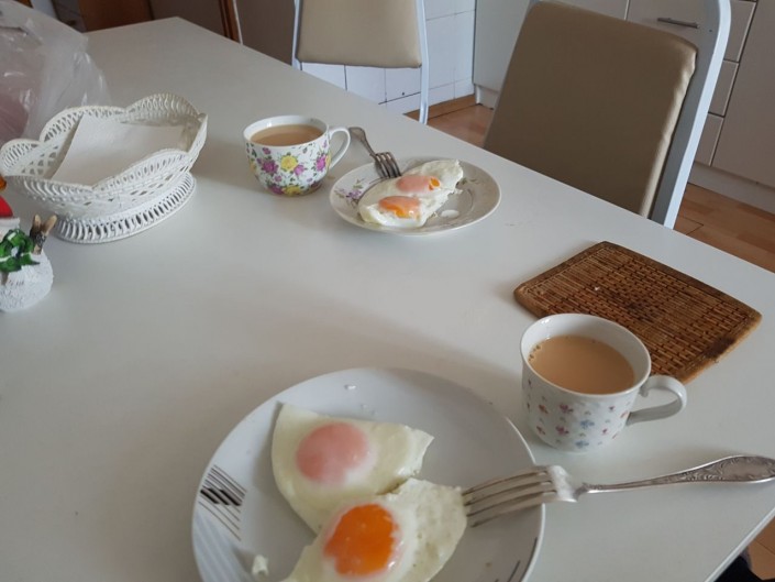 На завтрак Владислав Косарев готовит яичницу-глазунью и делает чай с молоком.