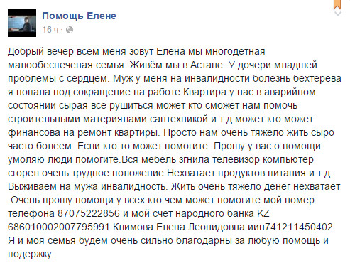 "Каждый год супруга кладут на переосвидетельствование инвалидности. У него третья группа. Сейчас врачи сказали, что у него пошло ухудшение, могут дать вторую группу. Что касается меня, работу можно быстро найти, это не проблема, просто меня сейчас больше волнует ситуация с квартирой, чтобы кто-то помог, может быть какие-то спонсоры. Я не за себя переживаю, за детей, им жить дальше, и поэтому прошу помощи, кто может, чтобы помогли финансово или стройматериалами, чтобы мы как-то восстановили квартиру", - обращается Елена. В Facebook есть страница, посвященная помощи этой семье.