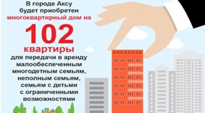 "В Аксу будет предоставлен в аренду многоэтажный дом, что позволит обеспечить жильем 102 семьи, в том числе малообеспеченные многодетные, неполные и семьи с детьми-инвалидами. Все эти меры социальной поддержки начнут действовать с 1 апреля этого года", - сказал Бегентаев. Он также добавил, что при начислении адресной социальной помощи многодетным не будут учитываться доходы от личного подсобного хозяйства.