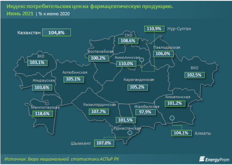 Цена фармацевтических препаратов в июне 2021 года возросла на 4,8 процента по сравнению с июнем прошлого года. Сильнее всего рост цен ощутили в Мангистауской области - сразу на 18,6 процента, а также в Нур-Султане (10,9 процента) и Акмолинской области (10 процентов).