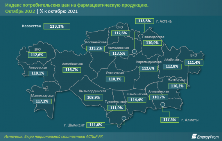 Больше всего лекарства подорожали в Алматы (на 17,5 процента), Мангистауской (на 17,1 процента), Актюбинской (на 16,7 процента), Жетысуской (на 16,2 процента) и Жамбылской (на 14,4 процента) областях, наименьший рост цен – в Кызылординской области (на 8,9 процента).
