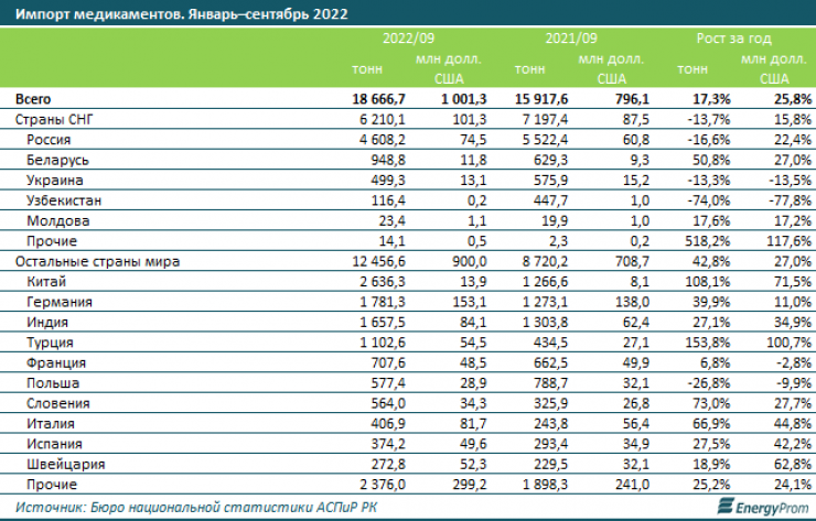 Из стран СНГ импортировали 6200 тонн медикаментов на 101,3 миллиона долларов. Основной объем пришелся на Россию (4600 тонн, минус 16,6 процента за год), следом идут Беларусь и Украина.