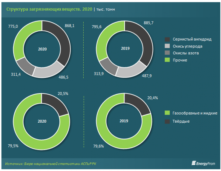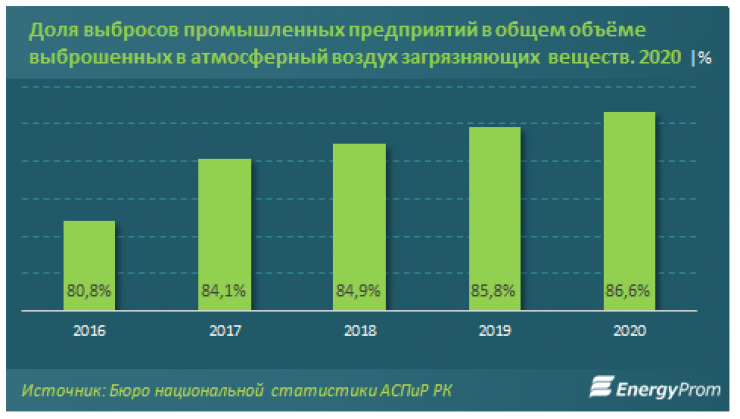 Объем выбросов загрязняющих веществ от стационарных источников в атмосферный воздух в Казахстане за 2020 год составил более 2,4 миллиона тонн, что на 1,7 процента меньше, чем за 2019-й. Сокращение объема выбросов было отмечено впервые за последние 5 лет, ранее в 2015 году показатель сокращался на 3,4 процента.