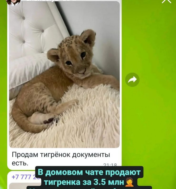 О продаже животного в соцсетях рассказала жительница Нур-Султана. По ее словам, в общем WhatsApp-чате соседей один из участников отправил фотографии львенка и текст объявления о продаже. Женщина возмутилась таким поведением автора и призвала защитников животных разобраться в ситуации. Она хочет узнать, насколько законно в Казахстане продавать детеныша льва.