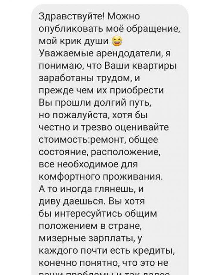 "Это ужас просто, уже 3 месяца ищем однокомнатную квартиру, но от цен просто шок честно. Откуда это искусственное поднятие цен, ничем не обусловленное, и с чего вдруг все арендодатели скопом решили, что арендаторы должны отдавать за квартиру все заработанные деньги? А жить на что? Водичку из крана пить? С такими ценами выгодно только цыганским табором снимать, вскладчину по 10-15 тысяч", - написала пользователь.