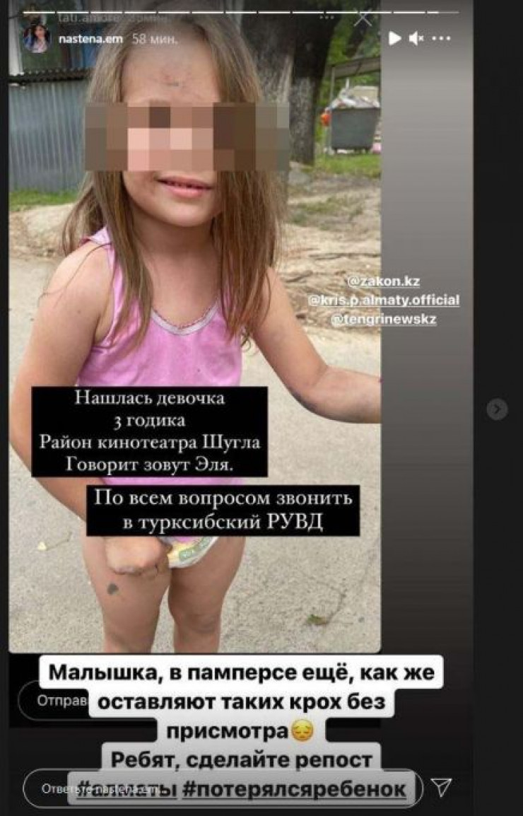 Трехлетнюю девочку нашли в Алматы. Информация об этом появилась в социальных сетях. В полиции рассказали подробности, передает корреспондент Tengrinews.kz.