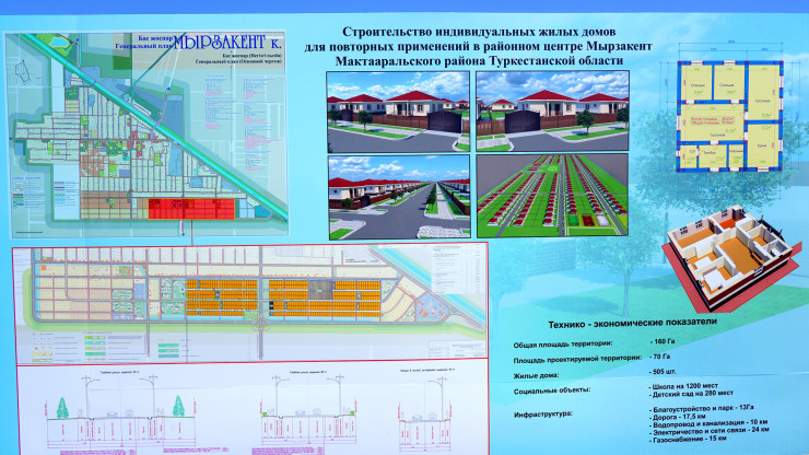 В административном центре Мактааральского района - поселке Мырзакент - премьер-министры Казахстана и Узбекистана  ознакомились с планом строительства нового микрорайона, провели встречу с местными жителями и приняли участие в церемонии закладки фундамента первых жилых домов.