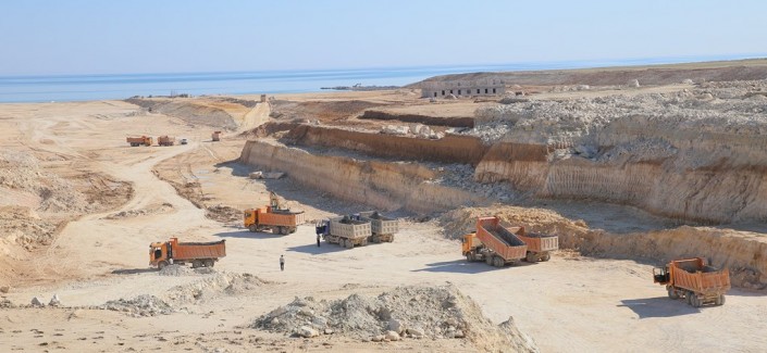 На строительство Западного оградительного мола доставлено 95 тысяч кубометров камня. Обеспечена ежесуточная доставка до двух тысяч кубометров камня. В ближайшее время в акватории порта начнутся дноуглубительные работы объемом 800 тысяч кубометров с участием бельгийской компании Jan De Nul.