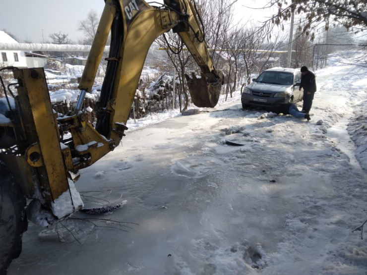 "Поселок Белбулак, улица Пушкина, не доезжая до Алтынсарина. Здесь у нас такая проблема, причем эта проблема не первый год. На протяжении 10 лет все время идет вода из канала. Когда сильные холода, она замерзает и выходит, соответственно, на улицы и топит наши дома. Здесь не то что проехать, даже ходить невозможно. Посмотрите, КамАЗ не может вытащить машину. Машина уже с ночи стоит, ее отапливают. Если не решите проблему, то даже не знаю уже, к кому обращаться", - сообщает один из местных жителей на видео.