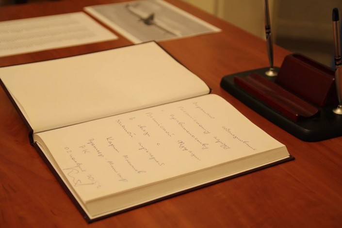 Масимов сделал запись в книге соболезнований посольства РФ в Астане Премьер-министр Казахстана Карим Масимов делает запись в книге соболезнований в посольстве России в Астане. Фото©Пресс-служба посольства РФ.