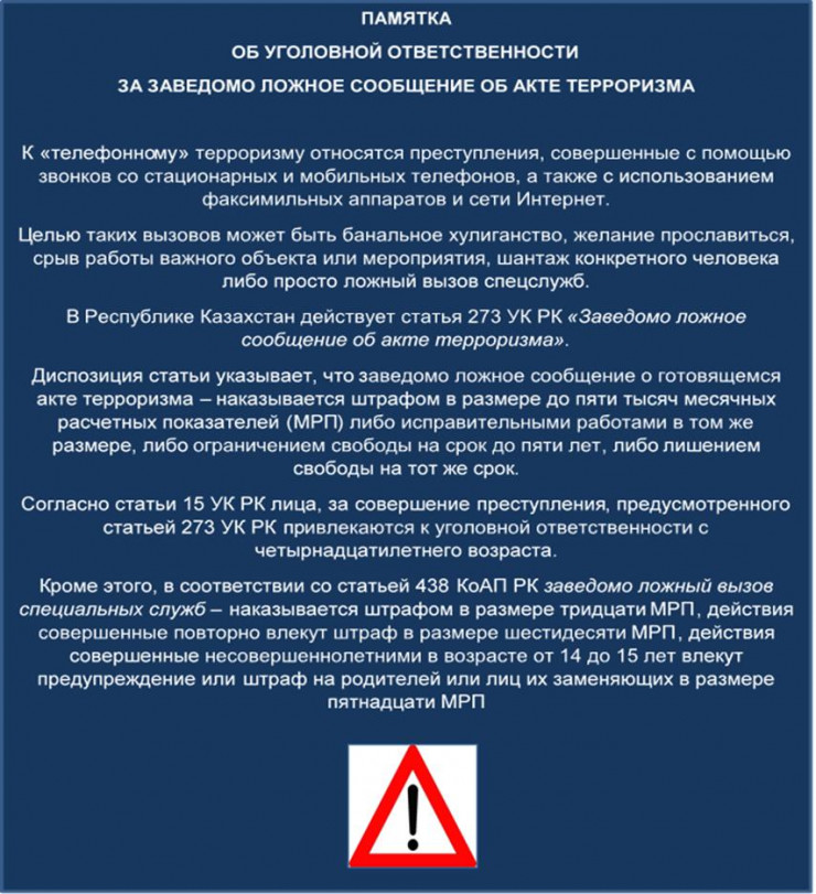 Отметим, что заведомо ложное сообщение о готовящемся акте терроризма наказывается штрафом в размере до пяти тысяч месячных расчетных показателей (МРП) либо исправительными работами в том же размере, либо ограничением свободы на срок до пяти лет, либо лишением свободы на тот же срок), нарушение по статье 438 Кодекса об административных правонарушениях РК "Заведомо ложный вызов специальных служб" наказывается штрафом в размере тридцати МРП, действия совершенные повторно влекут штраф в размере шестидесяти МРП, действия совершенные несовершеннолетними в возрасте от 14 до 15 лет влекут предупреждение или штраф на родителей или лиц, их заменяющих, в размере пятнадцати МРП.