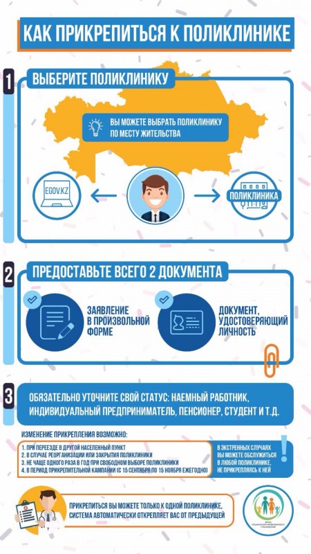 "Уважаемые жители города! Учитывая, что с 2018 года внедряется обязательное социальное медицинское страхование (ОСМС), городским поликлиникам необходимо определить количество и статус прикрепленного населения для планирования оказания объема медицинской помощи разным категориям граждан. С 5 апреля по 31 июня 2017 года начата кампания прикрепления населения к поликлиникам "Прикрепись к поликлинике - определи свой статус в системе Обязательного социального медицинского страхования!". В ходе прикрепительной кампании каждый житель страны должен проверить не только факт прикрепления к выбранной поликлинике, но и заявить о своей категории - наемный работник, индивидуальный предприниматель, самозанятый гражданин, не имеющий официальных доходов или нигде не зарегистрированный безработный. Важно уже сейчас определиться со своим статусом, понять к какой категории граждан вы относитесь, что необходимо для запланирования источника финансирования, то есть, кто оплачивает вашу страховку - государство, работодатель, либо Вы сами", - пояснили в управлении здравоохранения Алматы.