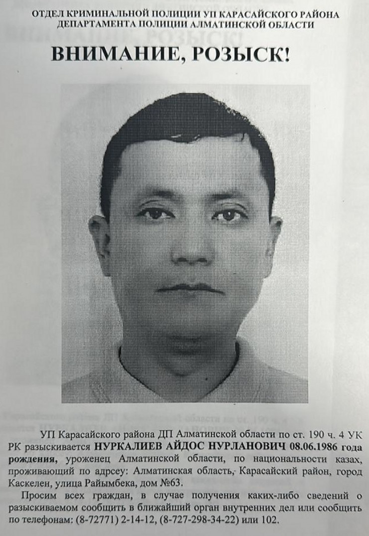 "Сотрудниками криминальной полиции объявлен в международный розыск Айдос Нуркалиев 1986 года рождения. Он подозревается в совершении преступления, предусмотренного статьей 190 Уголовного кодекса, то есть "Мошенничество", - подытожили в Департаменте полиции.